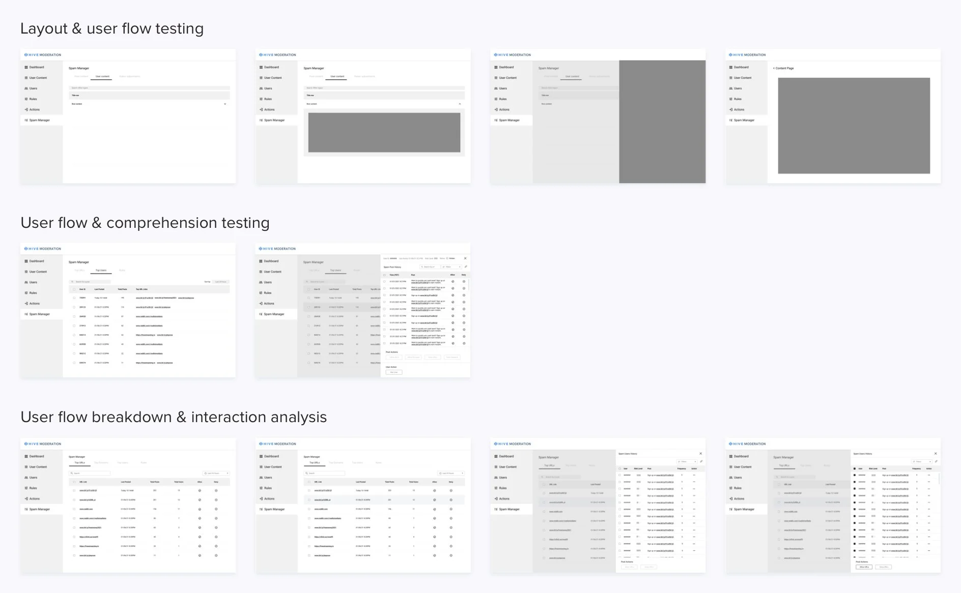 The project culminated in a fully functional V1 “spam” moderation dashboard, laying the foundation for future iterations. I worked closely with stakeholders to ensure final dev handoff was a smooth and collaborative process. With a robust, research-driven design, the dashboard is prepared to expand to a complete content moderation solution, accommodating various data types—text, images, video, and audio—and addressing broader content moderation needs outside of “spam”.
